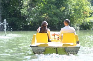 A legelső amit kipipáltam, a vízibicikli. Be kell valljam, féltem, hogy a gyerekek vízbe fojtják magukat és hogy hú de drága lesz, viszont itt Miskolc-Tapolcán alig ér derékig a víz és össz-vissz 900ftot fizettem egy fél órára (a fagyi is többe került) és ez volt életem egyik legszebb félórája és egy kép, hogy nem csak gyerekekkel érdemes elmenni, lepaparazziztuk az előttünk andalgó párt 😛